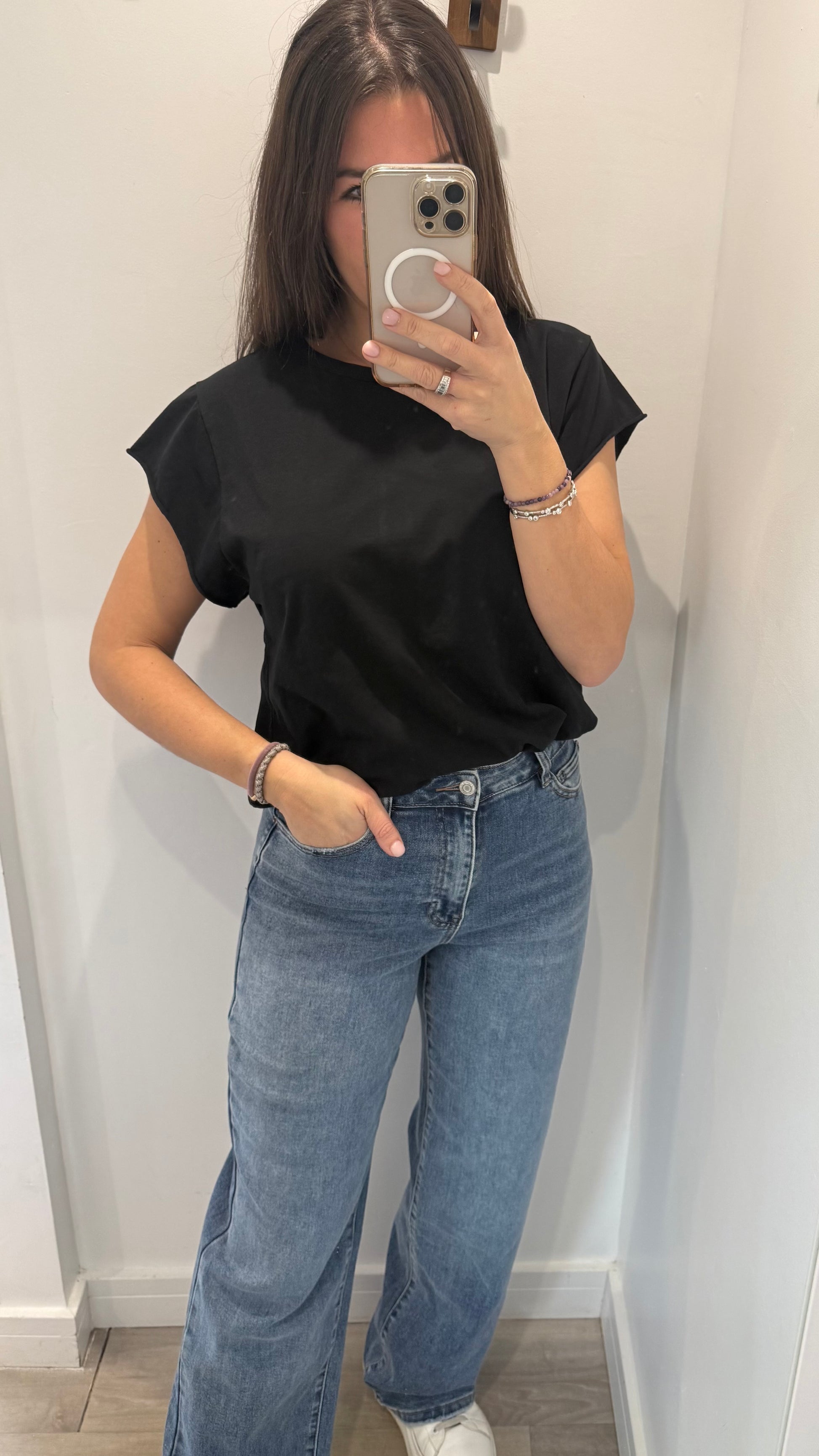 Sam Whitbread Great one-size T-shirt! The fabric is soft and comfortable, and the cap sleeves give it a flattering look. The black colour goes with everything, making it an easy everyday top.