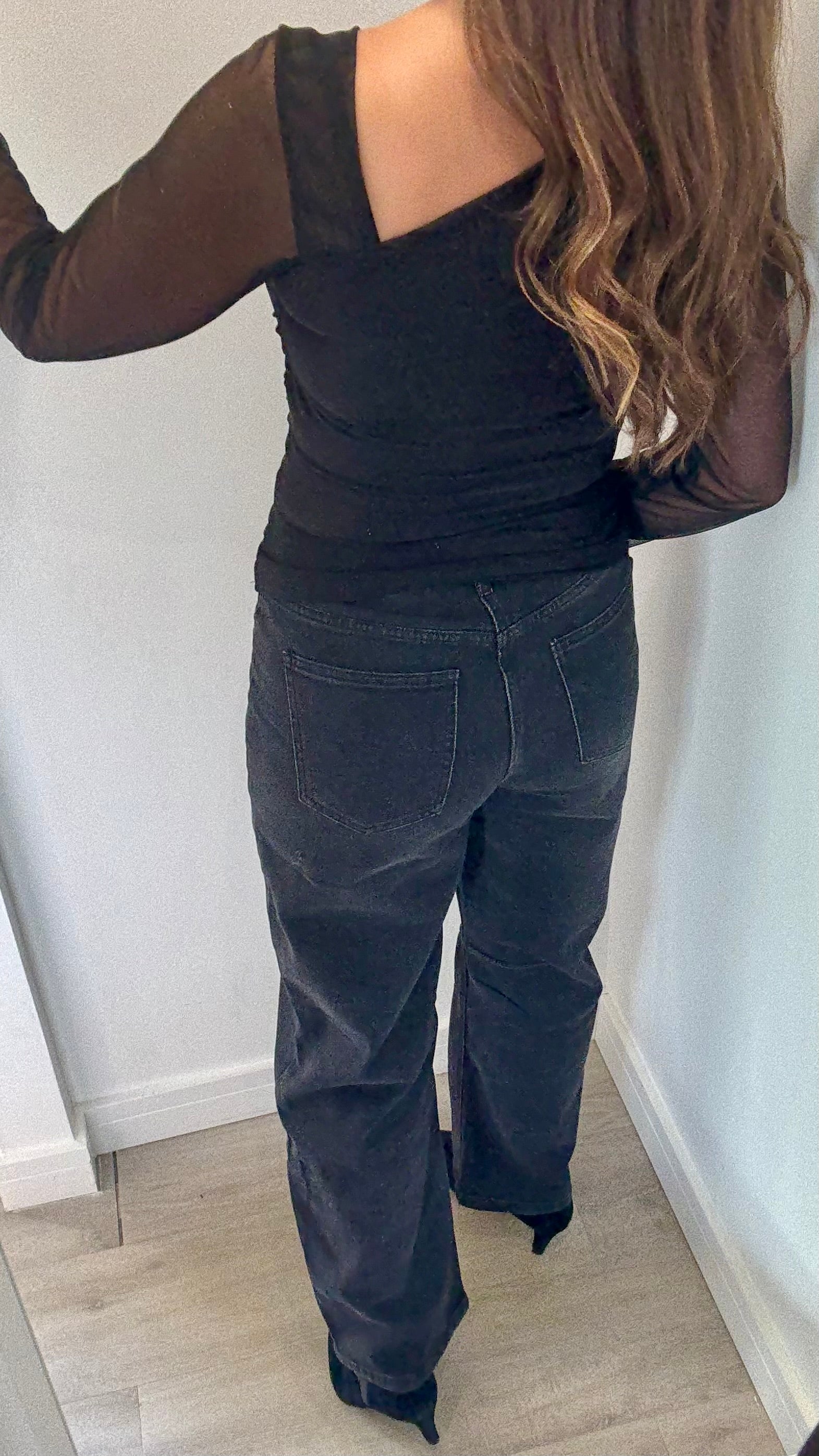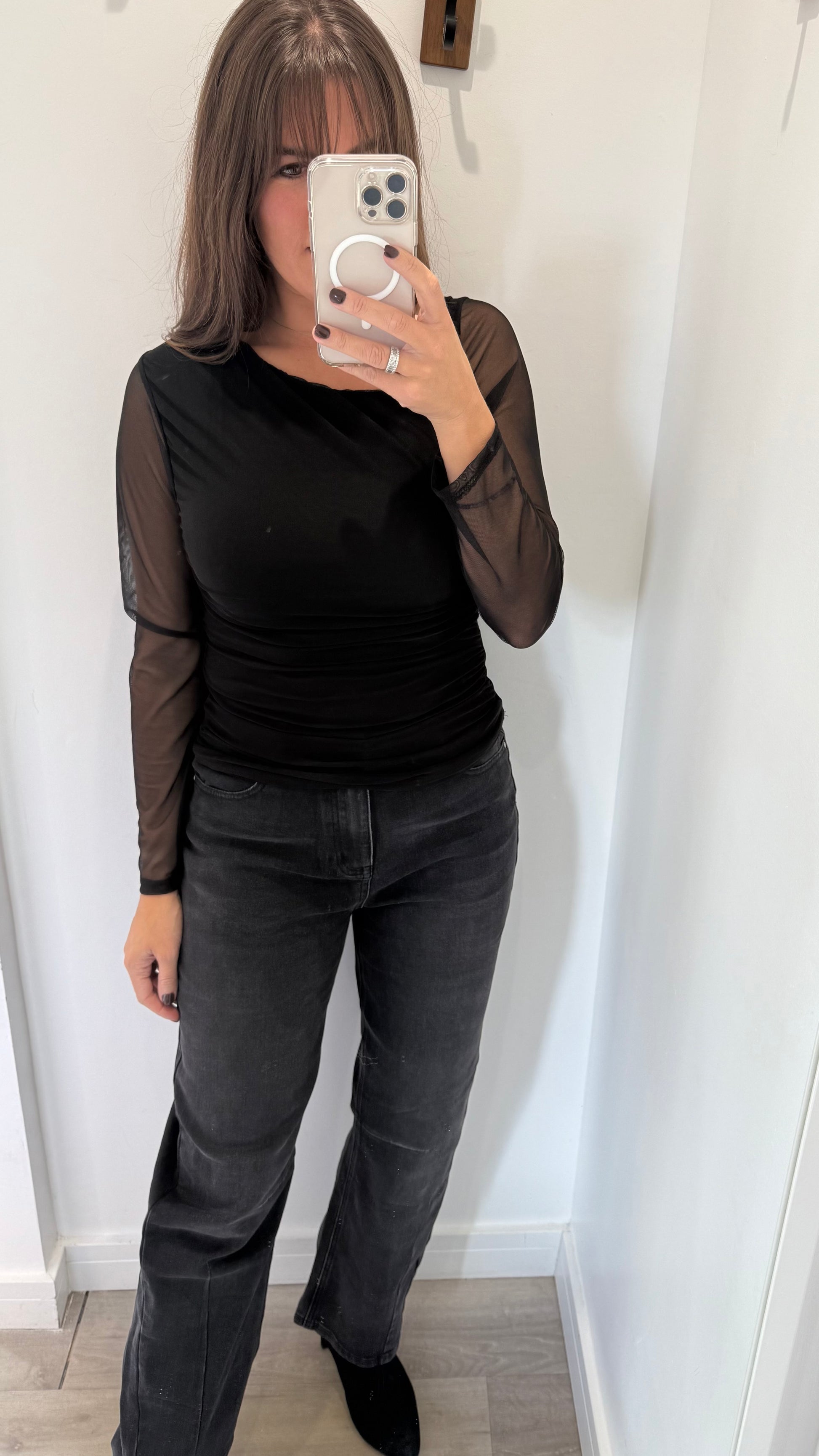 The Black Mesh Top is your statement layering piece. With opaque main body, sheer arms and a subtle asymmetric neckline, it adds a touch of intrigue and femininity without compromising versatility.