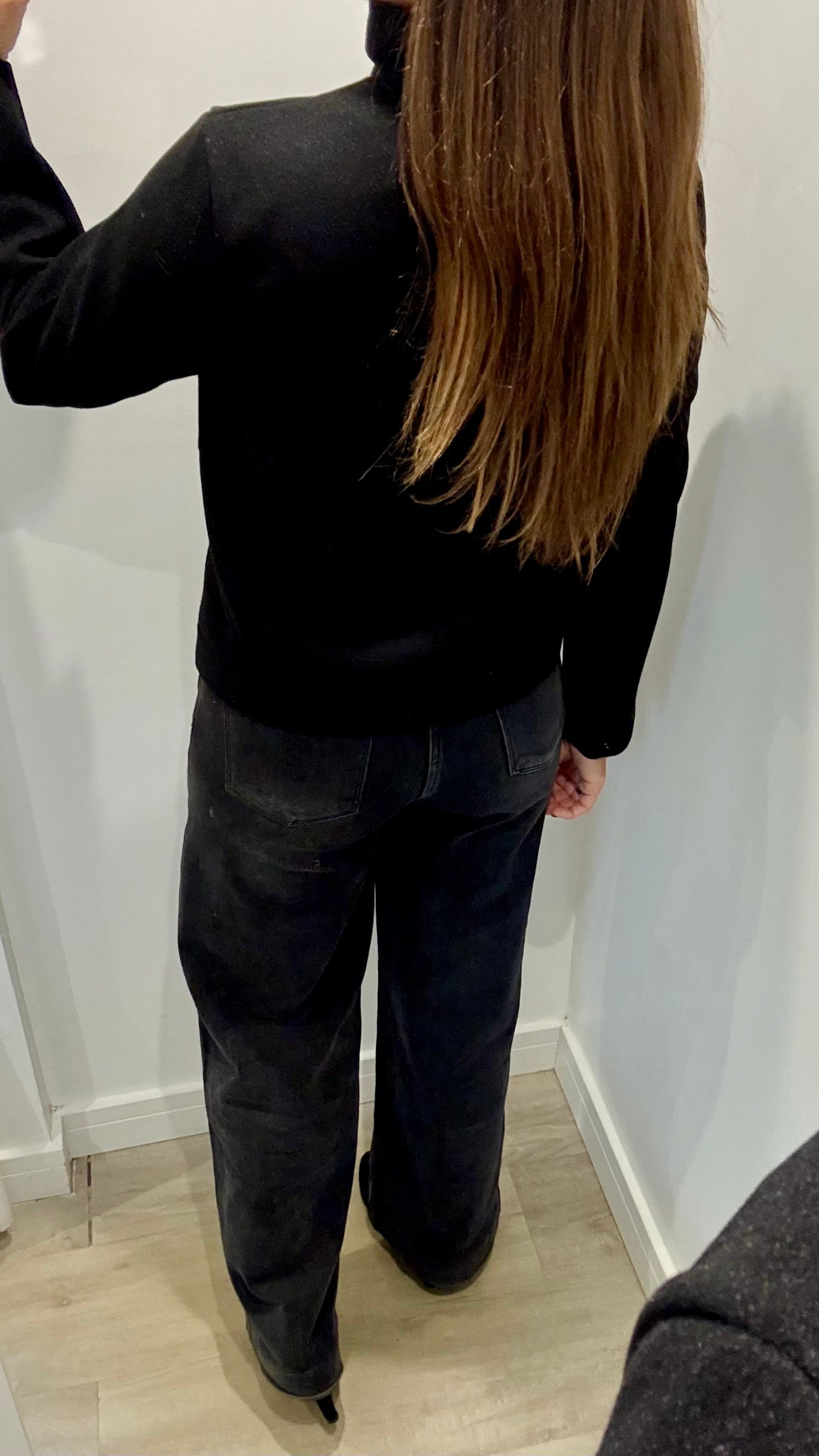 The jacket that transforms every outfit. This black military-style jacket is a timeless wardrobe staple — structured yet soft, double-breasted with silver buttons and a collar you can wear up or down.