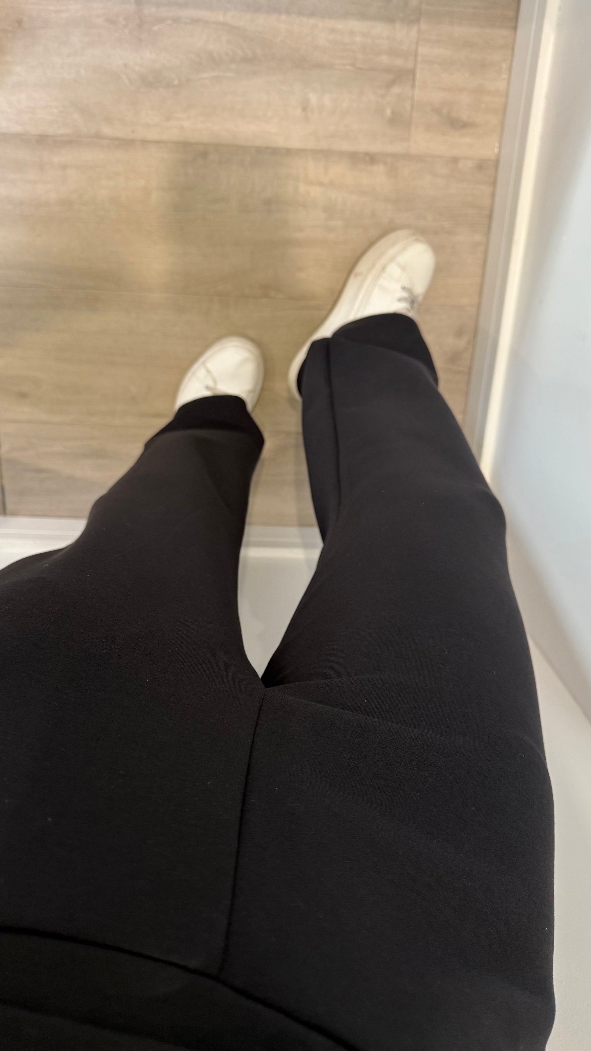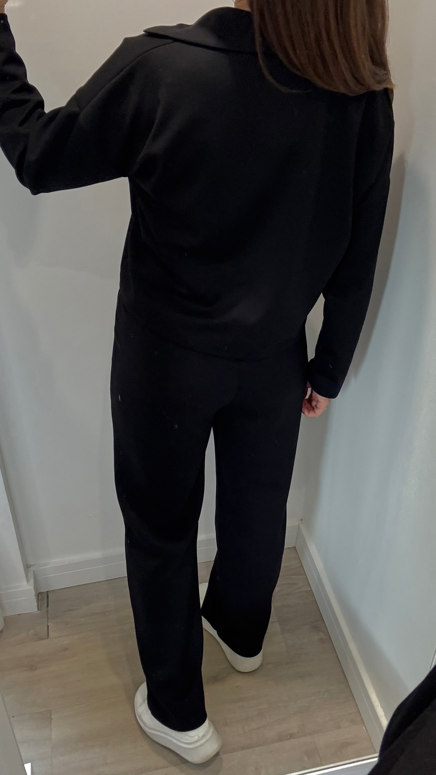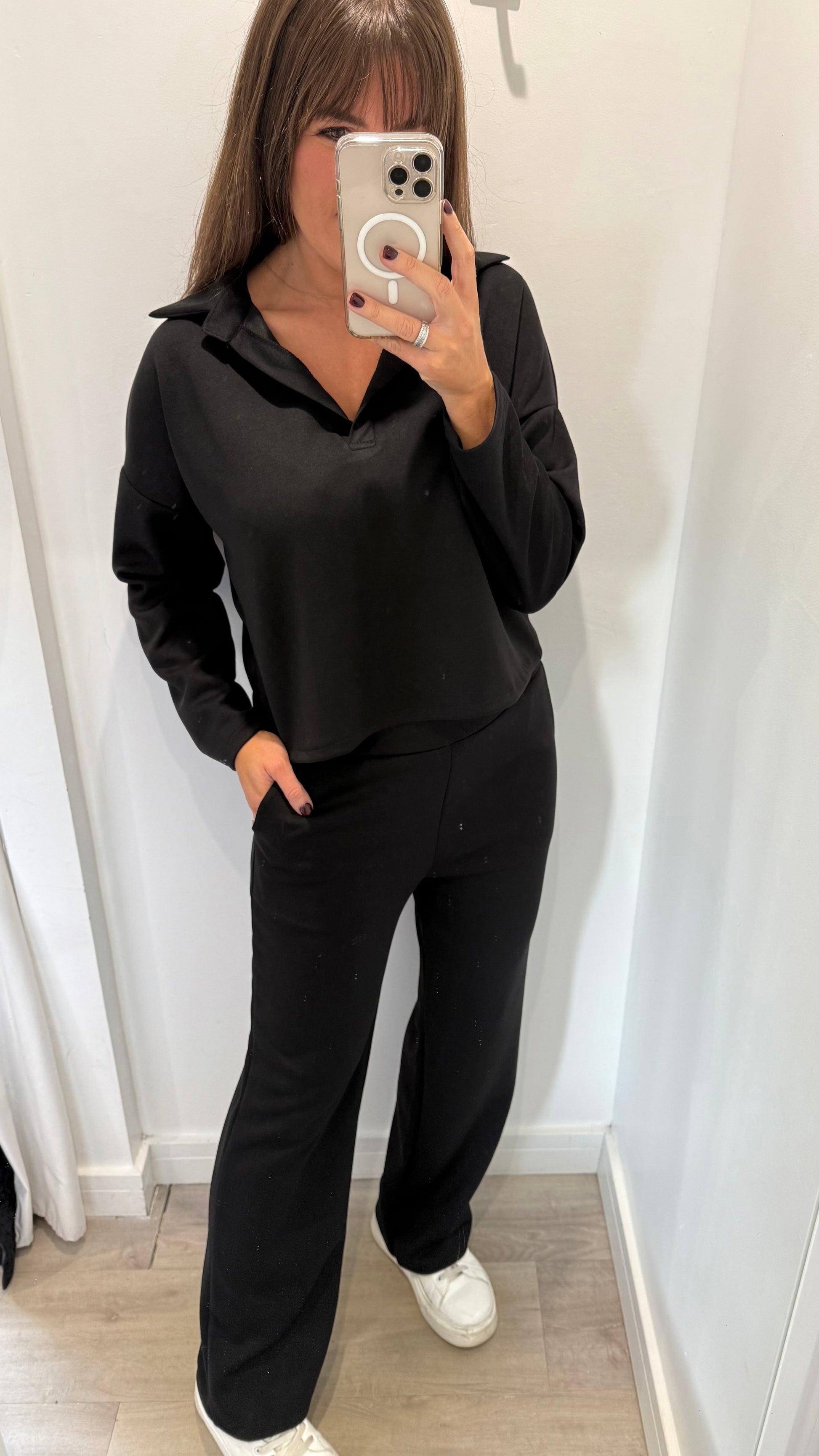 This soft, drapey black set includes straight-leg trousers with pockets and a v-neck collared top — comfy enough for home, polished enough for the school run or errands.