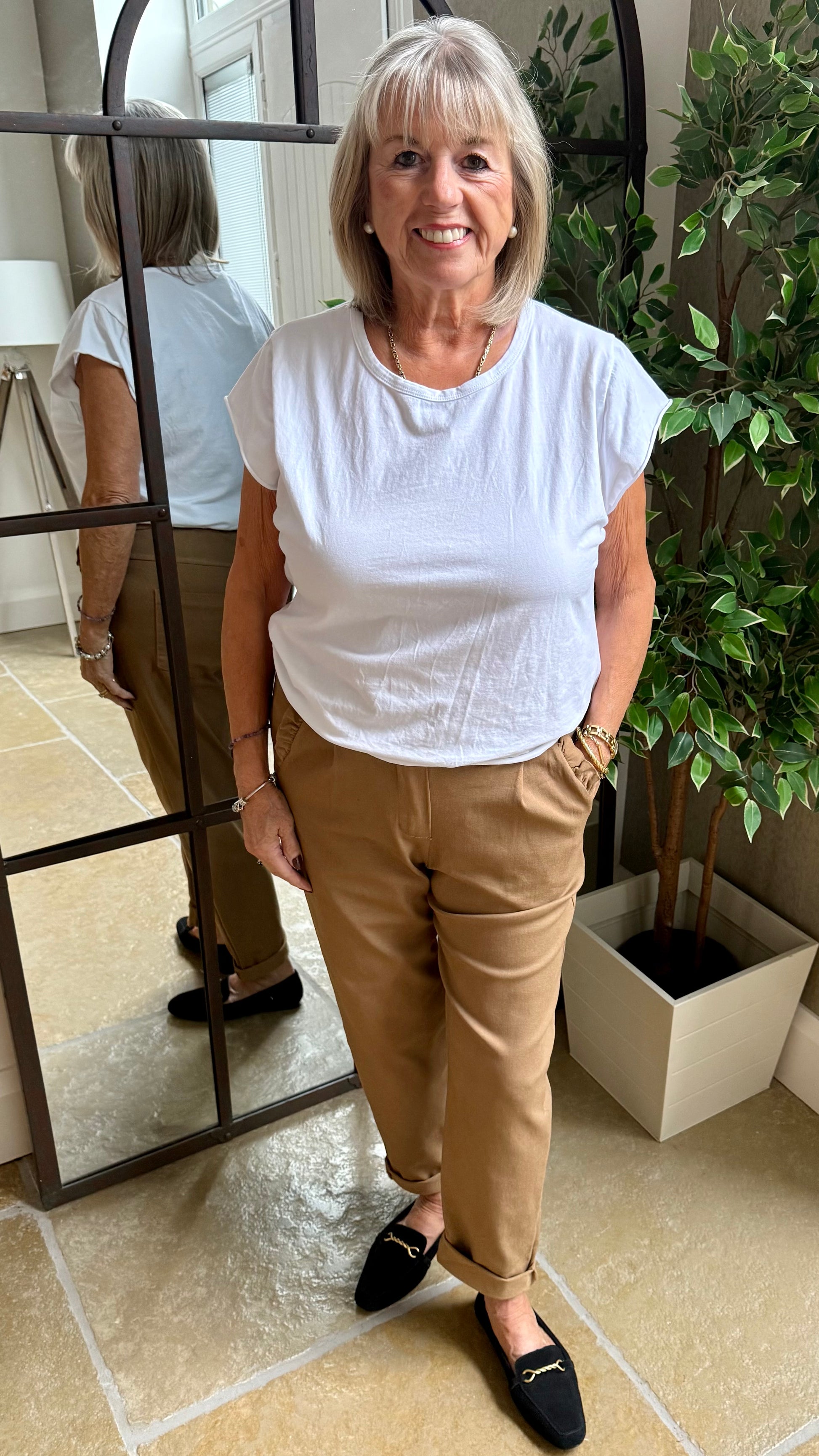 Comfort meets polish in these tan chino-style straight magic pants. With an elasticated waist for ease, button fastening for structure, and pretty frill pocket detail, they’re the trousers you’ll reach for again and again. Fit sizes 8–16, with a turn-up or down hem for versatility.