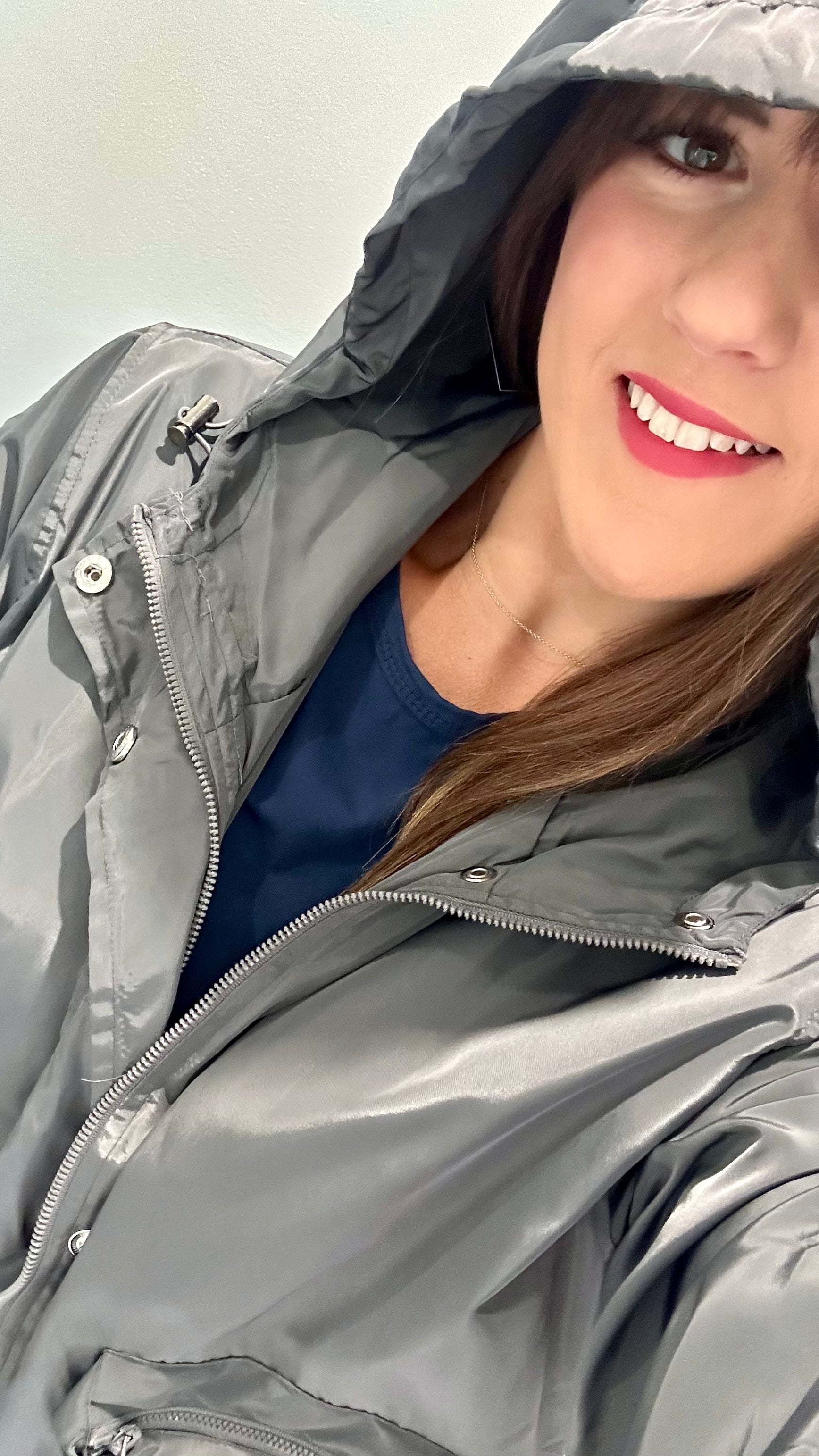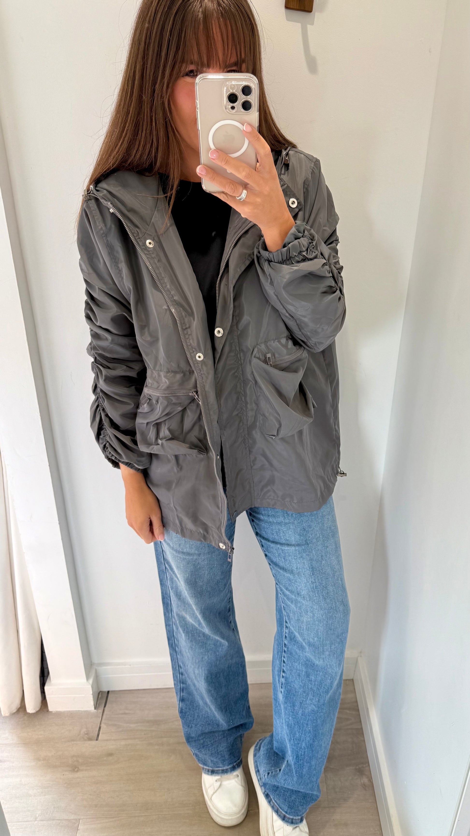 British Summer? Sorted. This lightweight showerproof raincoat in classic charcoal grey is your go-to layer for unpredictable weather. Featuring a zip and popper fastening, subtle sleeve ruching, two practical pockets, and drawstring sides for shape-shifting style – wear it long or pull up for a shorter silhouette. Complete with a practical hood that can be folded back when the clouds pass.