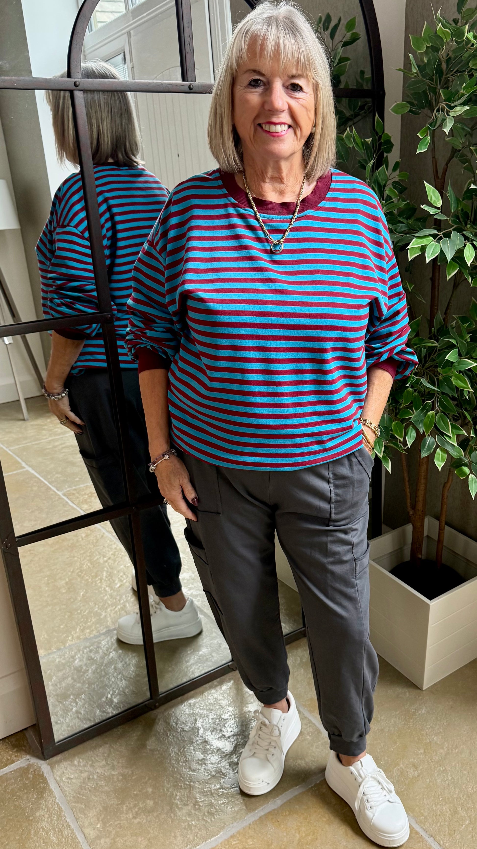 Ness wears the white cap sleeve tee and pale grey ruched sleeve blazer, while Mama Keep styles them with the merlot & blue stripe crew sweat top