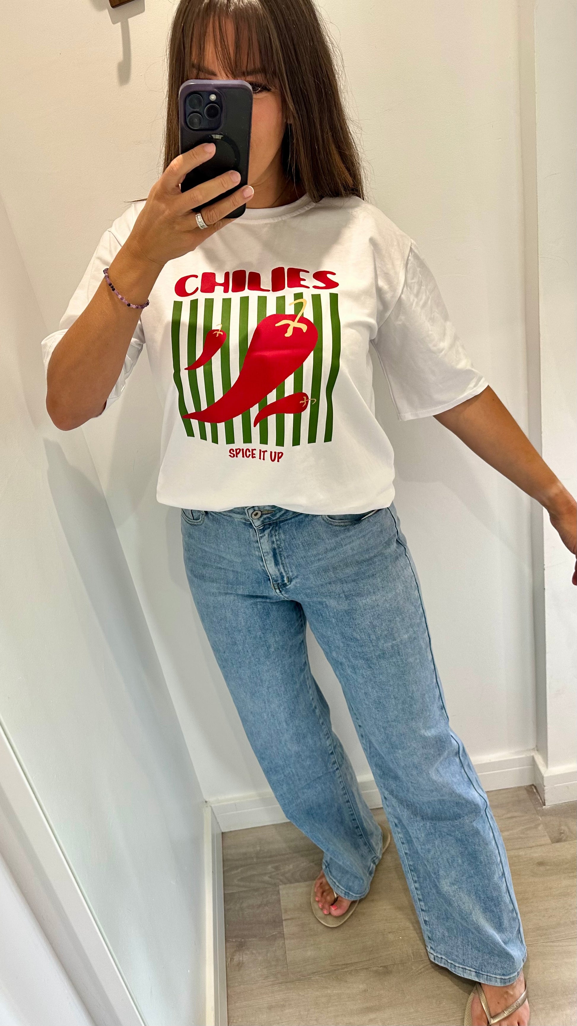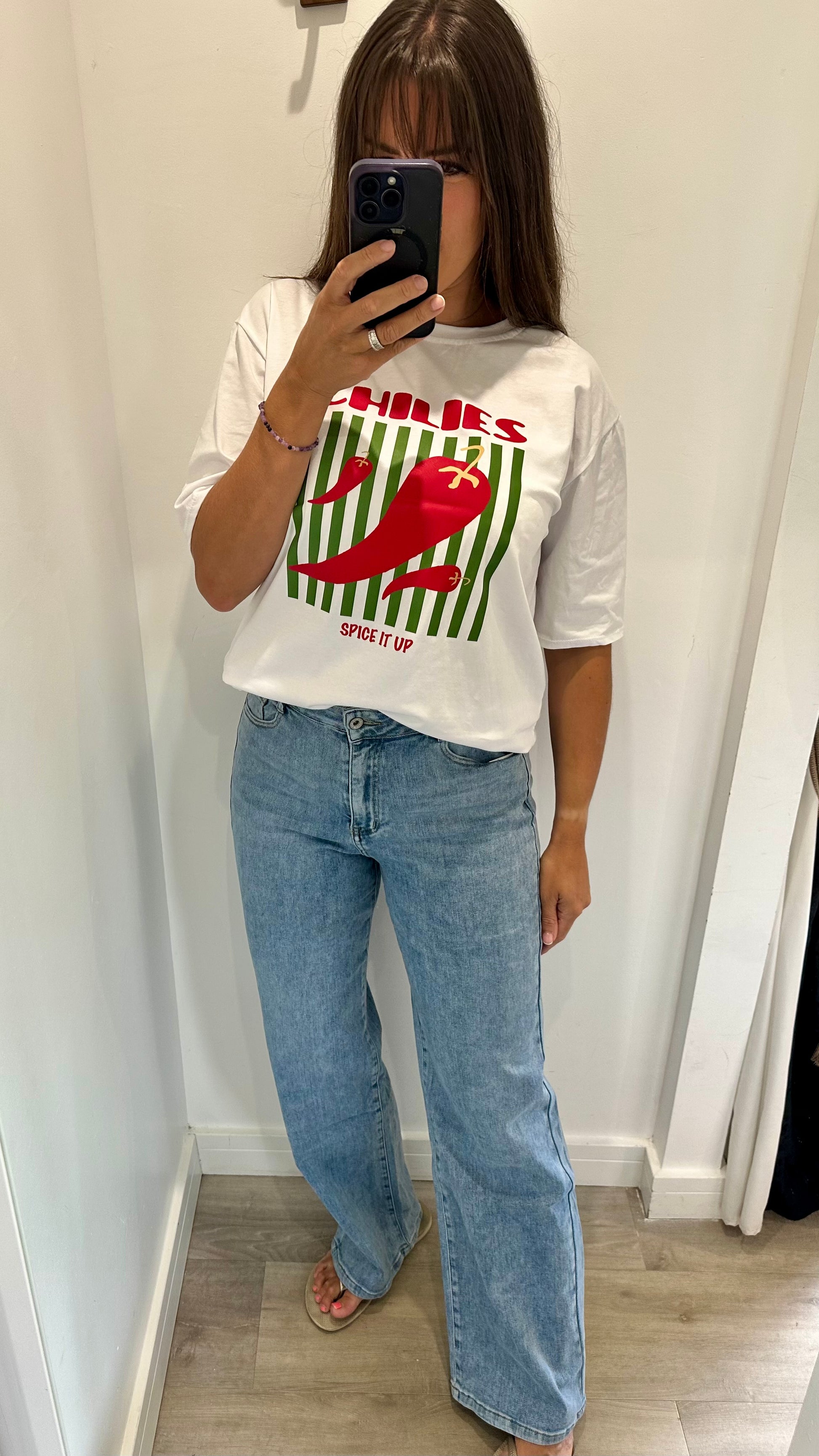 Spice things up with this playful white tee, featuring green box stripes and a bold red chilli print front and centre. The graphic slogan says it all – “CHILLIES” up top, “SPICE IT UP” beneath in a smaller font – making this tee a fun, standout staple for your casual wardrobe.