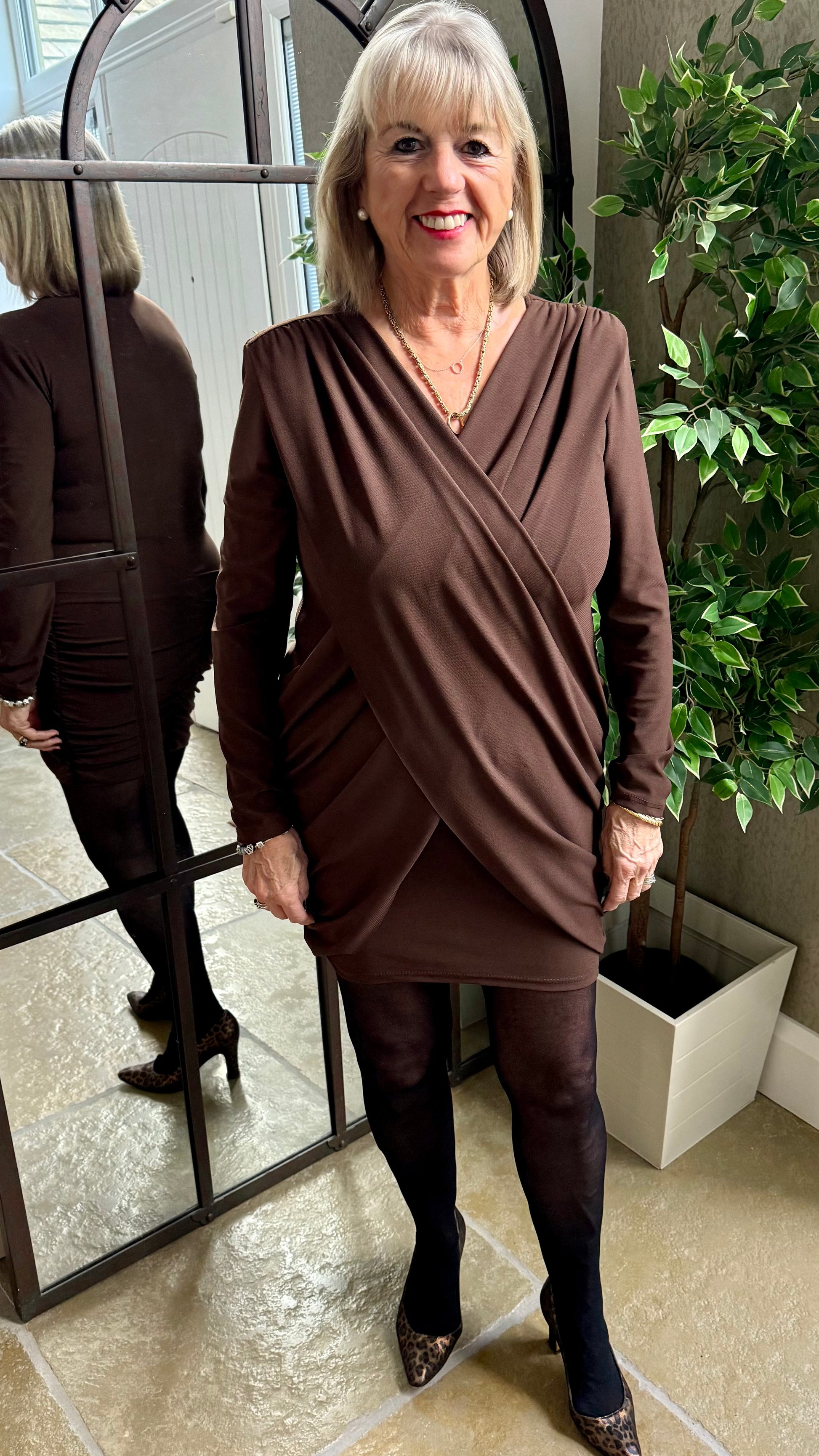 Your most flattering Autumn dress has arrived. This chocolate wrap style dress is designed to celebrate your shape — the cross-over neckline defines the waist, while the subtle ruching across the bum creates a smoothing, confidence-boosting fit.