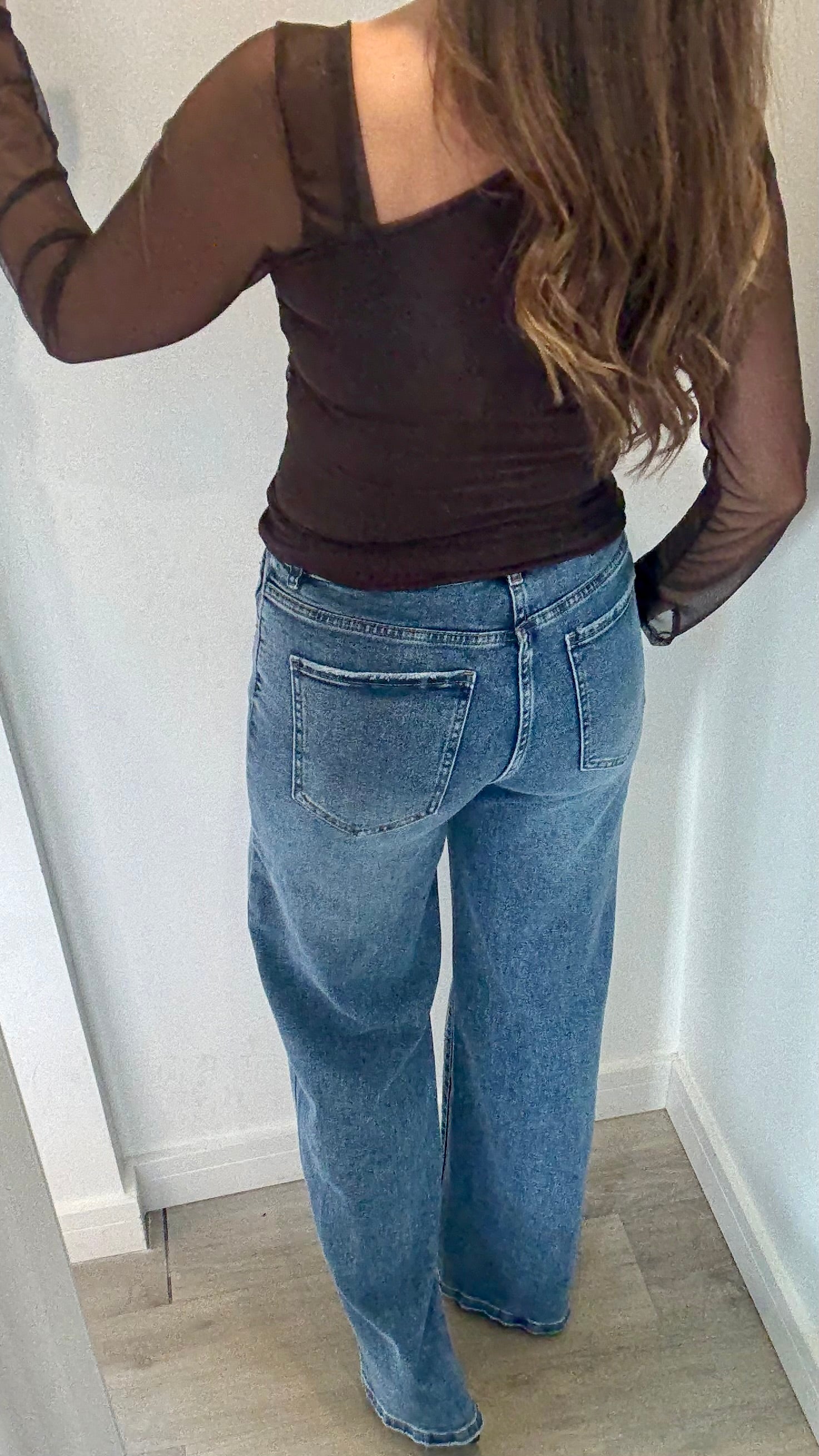 CHOCOLATE MESH SHEER SLEEVE TOP WITH ASYMMETRIC NECKLINE