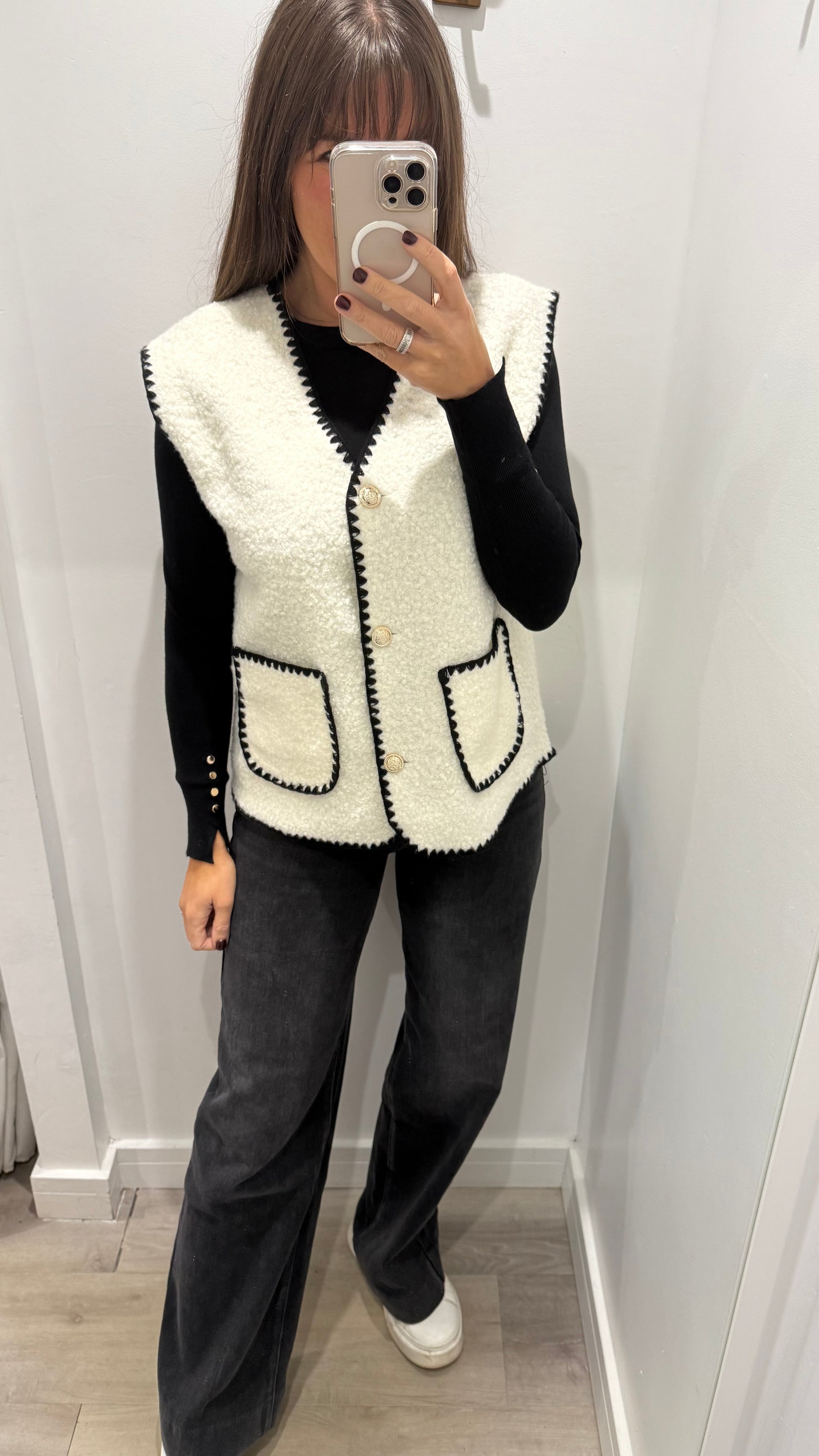 CREAM BOUCLE SLEEVELESS GILET WITH BLACK EDGING