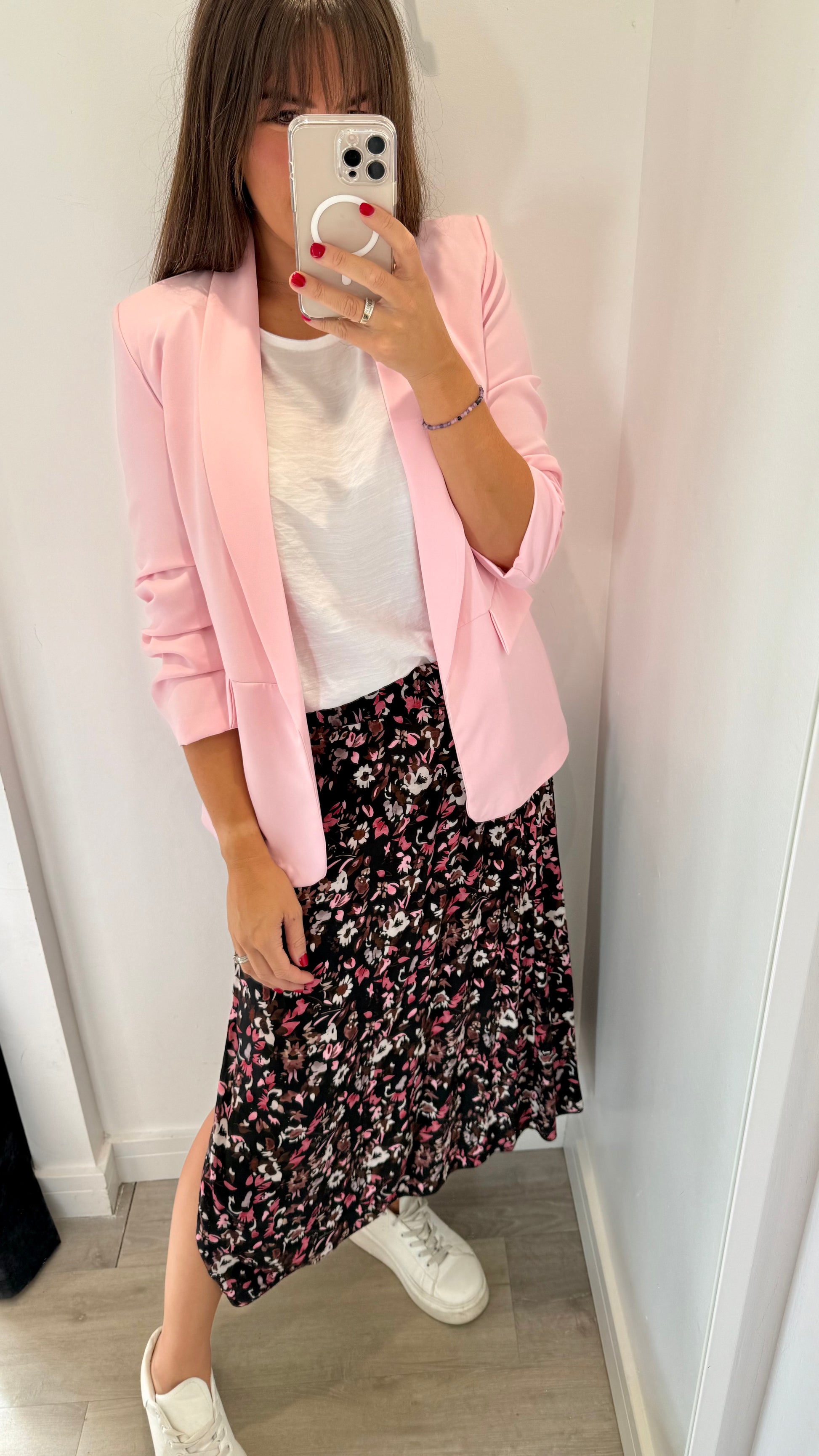 Your new go-to for polished, pretty, and practical. The Blush Bloom Midi Skirt in black features a romantic floral print in soft blush and nude tones, set against a versatile black base. Designed with a flattering elasticated waistband and a subtle side split for ease of movement and a touch of sass.