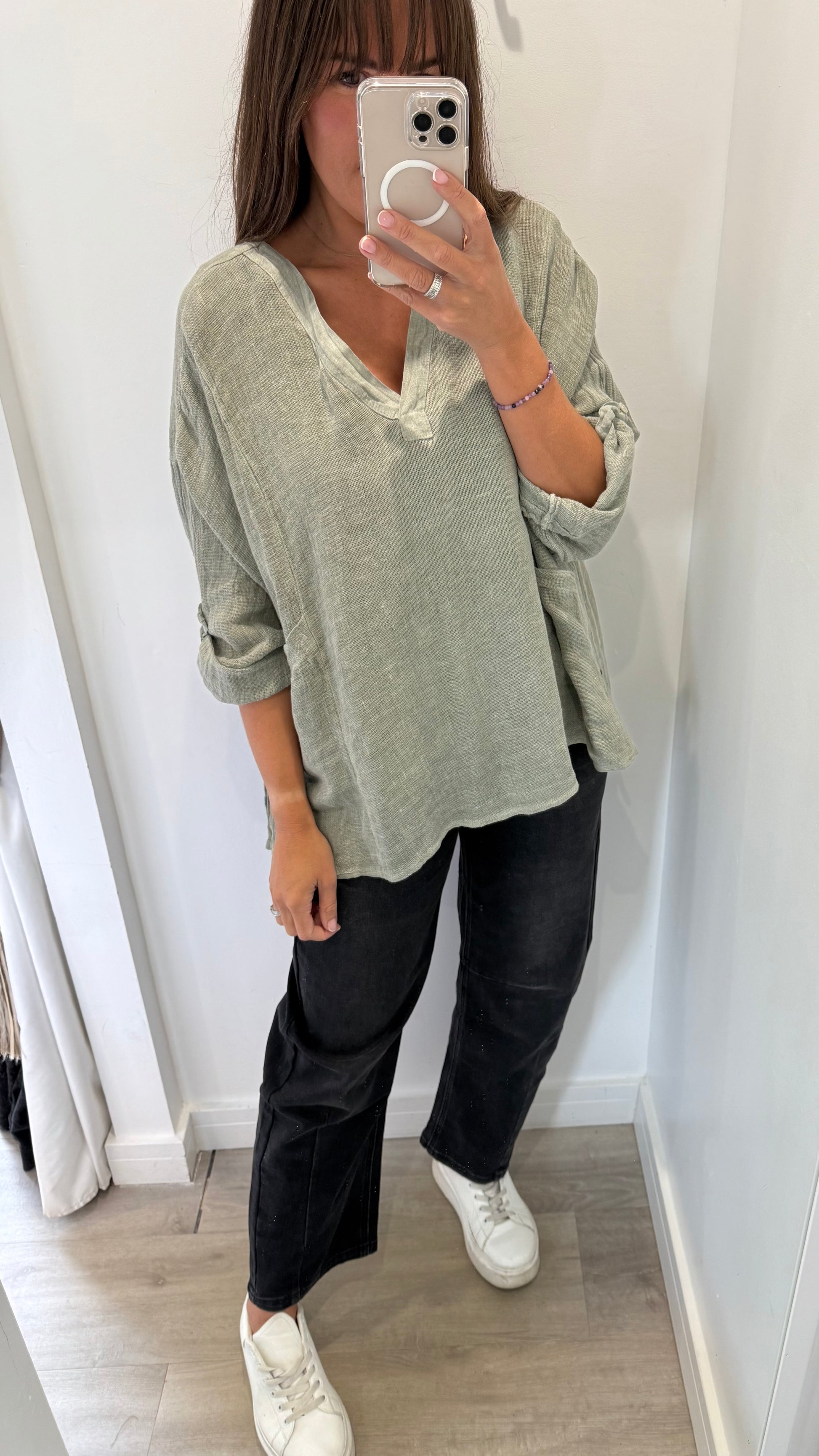 A wardrobe all-rounder in muted khaki, this lightweight linen blend top is soft and breathable with thoughtful details built in. It features deep hidden side pockets, roll-back sleeves with button tabs, and a dipped hem that covers you at the back but still looks flattering at the front. The subtle shoulder seam and back pleat give it an easy shape that falls just right. Works with denim, linen trousers or even layered over a vest dress.