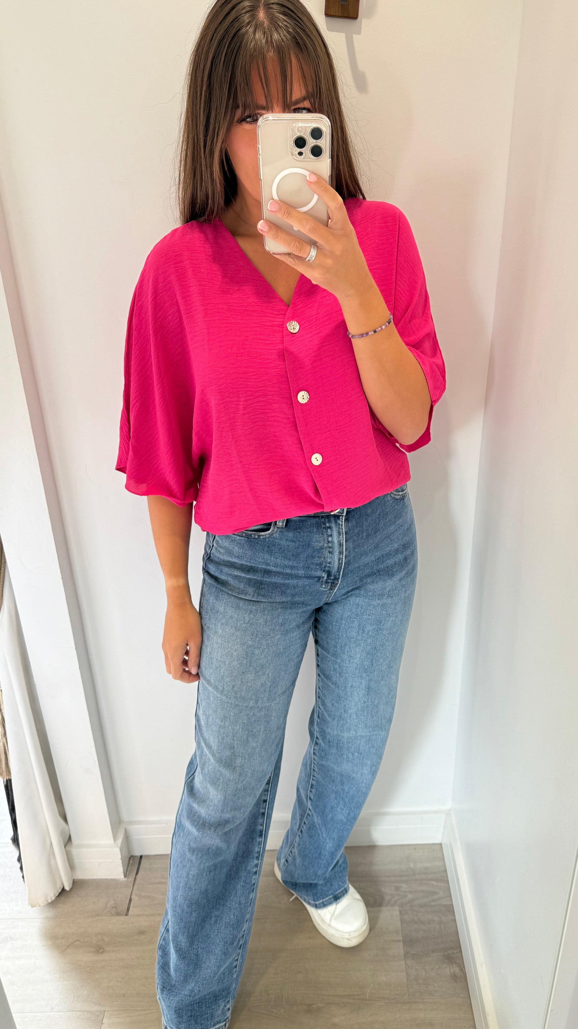 BRIGHT PINK FLOATY SLEEVE BUTTON TOP