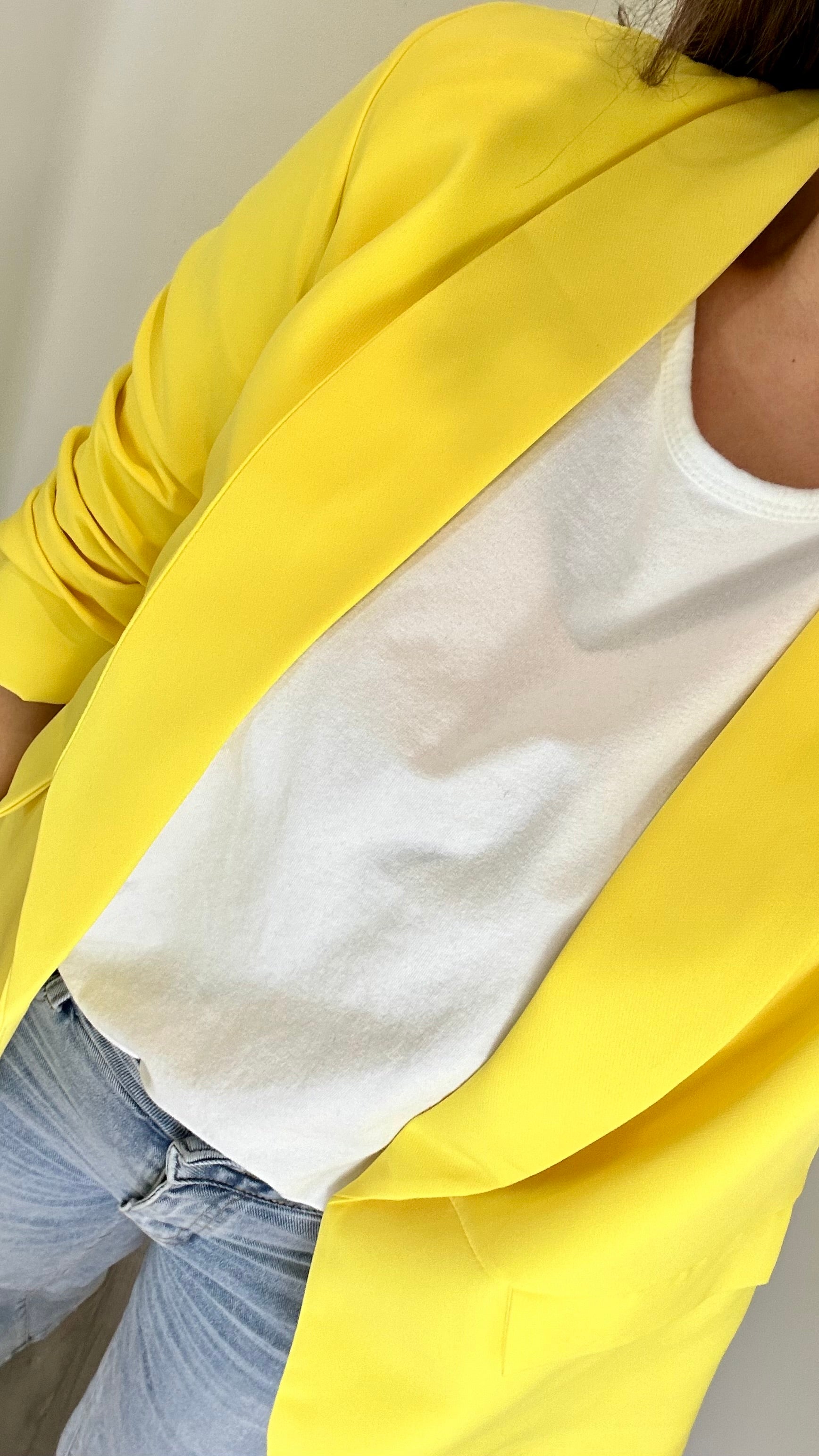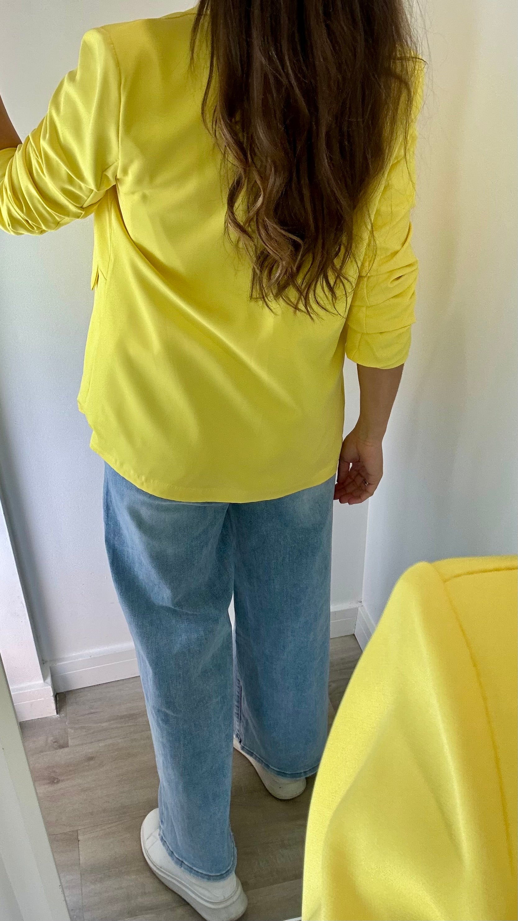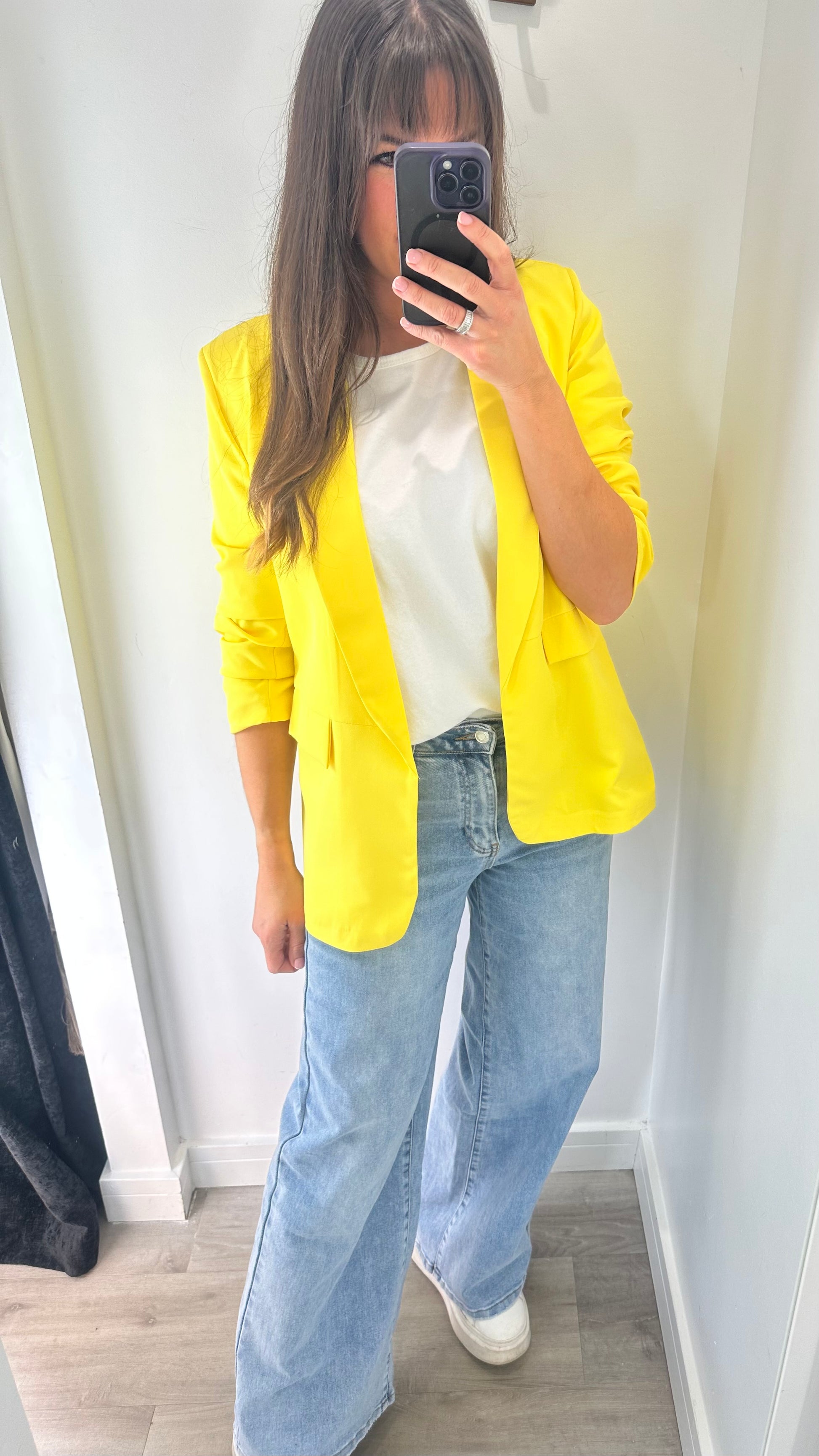 Our bestselling blazer just got a sunny new update! This gorgeous yellow ruched sleeve blazer is the perfect way to add a pop of colour to your wardrobe this Spring. Light, effortless, and so easy to style - it's made for busy women who want to look chic without the fuss. With its flattering fit, relaxed ruched sleeves, and feel-good shade, it's the ultimate throw-on-and-go piece. Dress it up or down and brighten up your day!